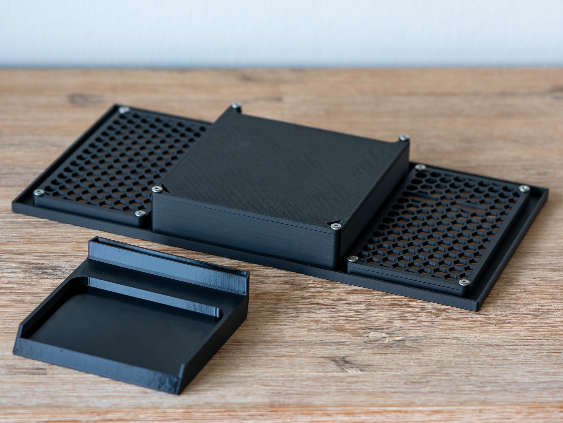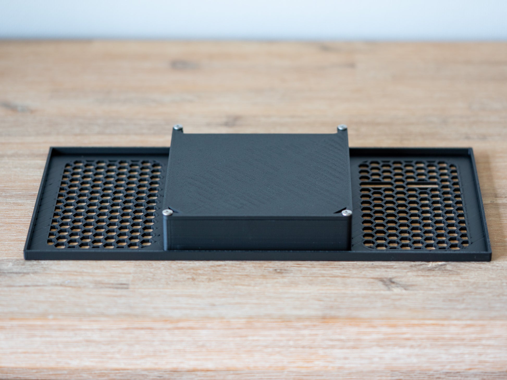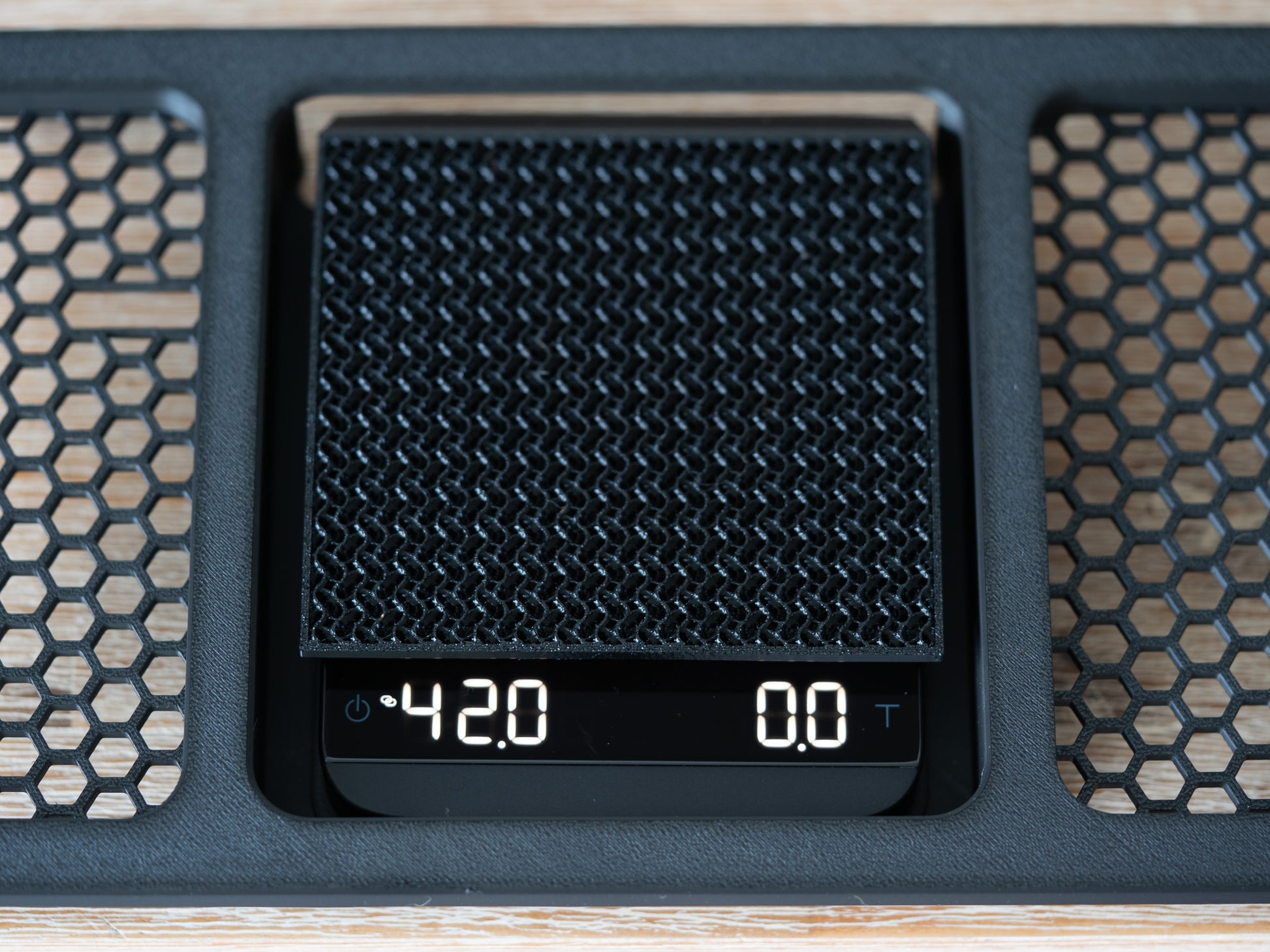 Manufactured using high-quality 3D printing, the grid impresses not only with its function but also with its design. The precise recess allows you to simply leave the Acaia Lunar scale in place, so the rinsing process can be started without any problems – without having to remove or move the scale each time. The scale is completely protected by the rubber mat.